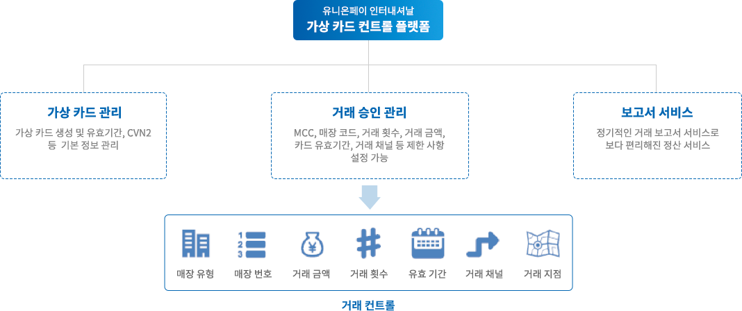 • 가상 법인카드 컨트롤 플랫폼은 다양한 기능을 통해 기업이 다른 국가 간의 결제를 진행하는 데 도움을 드립니다. 플랫폼은 다음과 같은 기능을 제공합니다: