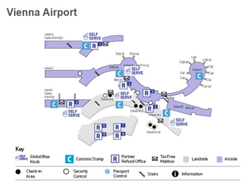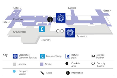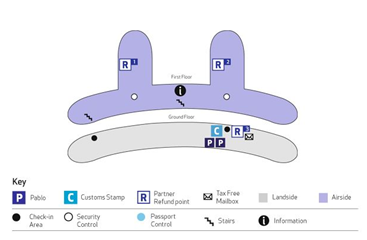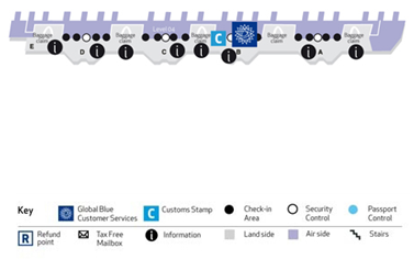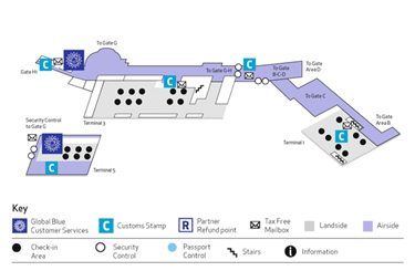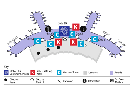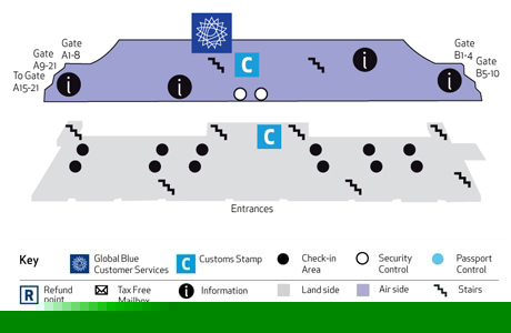 Check-in Luggage Tax Refund Inspection is near Counter A and C Carry-on Luggage Tax Refund Inspection is near Gate 219