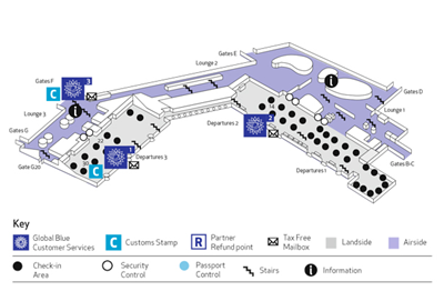 the departure procedure) and the Departure Transit Lounge in Terminal 1, 2 and 3 (after