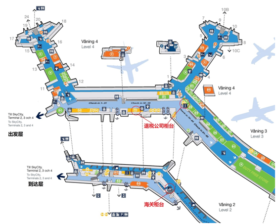 2. If tax-free goods are within the check-in luggage, then before going through the boarding procedure, please apply to the Customs Office for tax refund by presenting your Tax Refund Form, passport, tax-free goods and sales slip to the Customs Office (near the entrance to the Arrival level) for inspection and stamping.