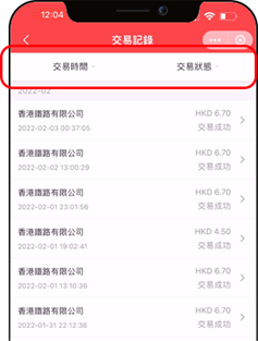 亦可按交易時間及交易狀態篩選交易紀錄