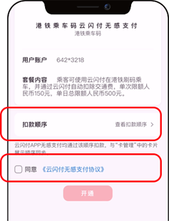 用戶可設置扣款順序,並勾選「同意《雲閃付無感支付協議》」以開通服務