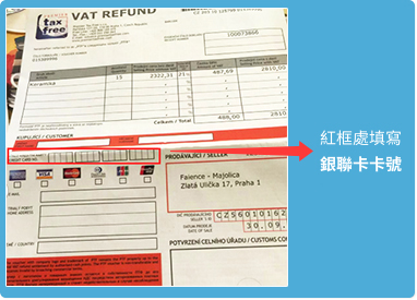 可以。商戶提供的退稅單據的退稅選項一般有「銀行卡」、「現金」、「支票」3種選擇。只要在「銀行卡」一欄(如下圖)填寫銀聯卡卡號便可。如在機場退稅櫃檯申請退稅,亦可告知服務人員選用銀聯卡退稅。